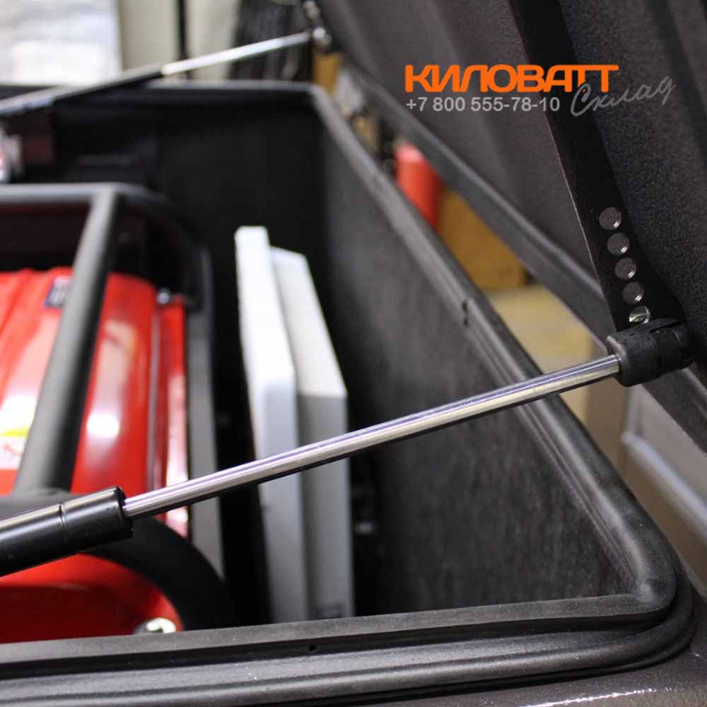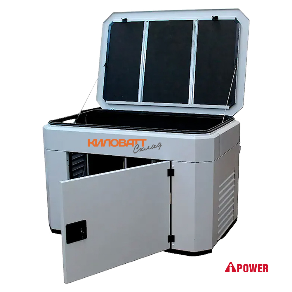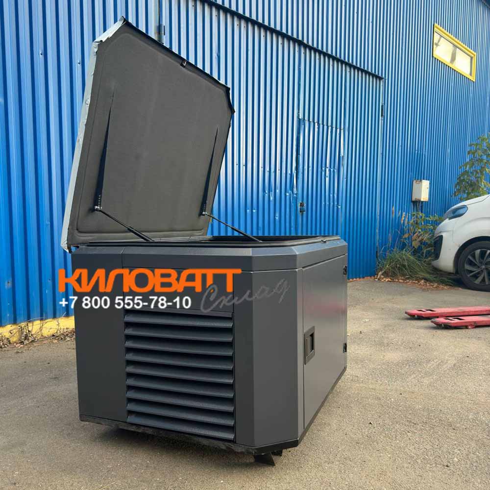 Удобный доступ: Верхняя крышка оснащена газовыми пружинными амортизаторами, позволяющими легко и плавно открывать и фиксировать ее в открытом положении. Две боковые двери, в сочетании с верхней крышкой, обеспечивают удобный доступ к генератору со всех сторон для обслуживания.